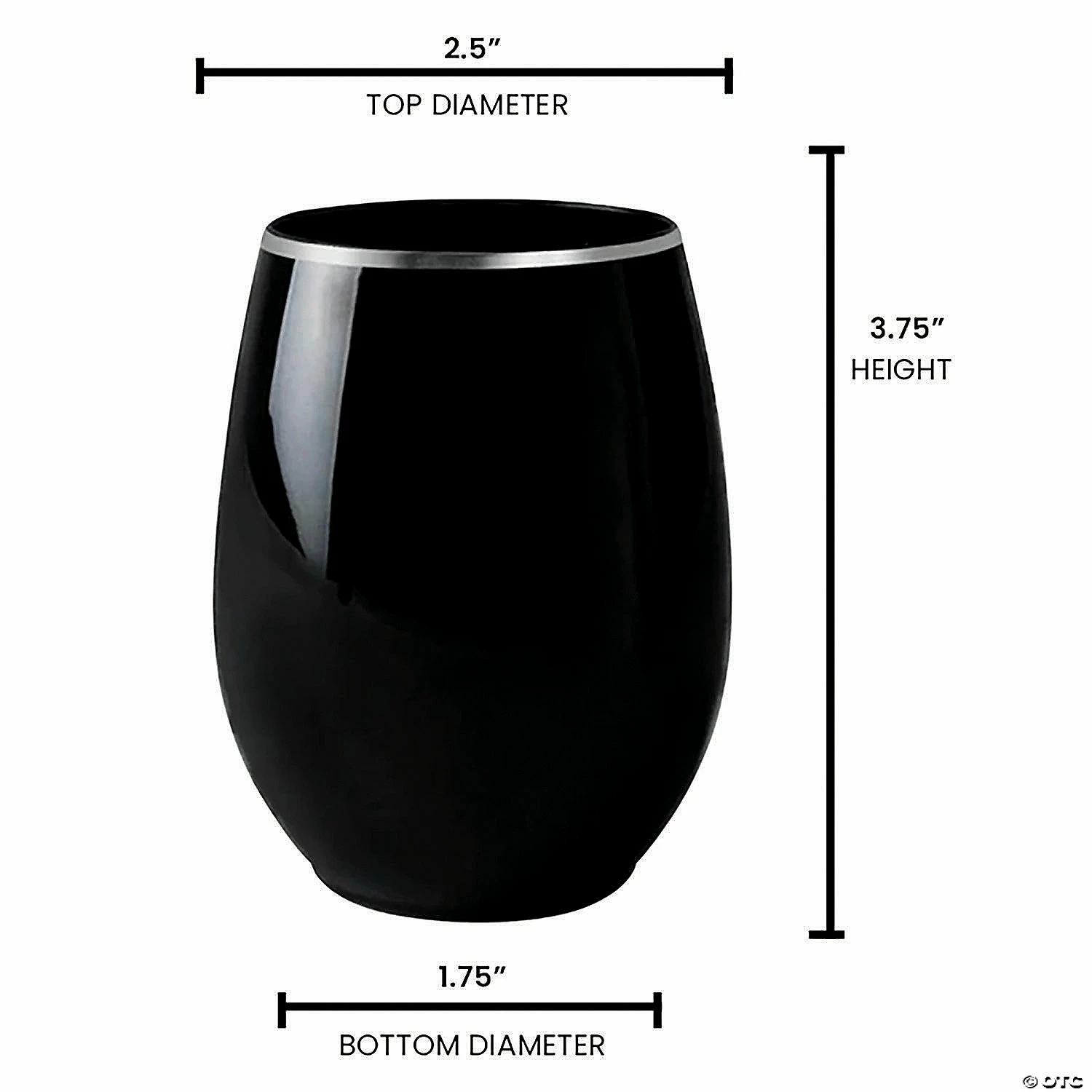 • Approx. top diameter: 2 ½”• Approx. bottom diameter: 1 ¾”• Approx. height: 3 ¾”• Flush fill capacity: 12 oz• Practical fill capacity: 8 oz• Quantity: 2 packs of 16 glasses• Color: Black with Silver Rim• Shape: Round• Material: Plastic• Disposable: One-time, single party use• Recycling code: #6 PS Polystyrene• BPA-free: Yes Special Shipping Information: This item ships separately from other items in your order. This item cannot ship to a P.O. Box. This item may be subject to additional processing days. Item is not eligible for expedited shipping. You may initiate a return for unused items within 30 days, if the items are in original packaging with all original materials included with the shipment.