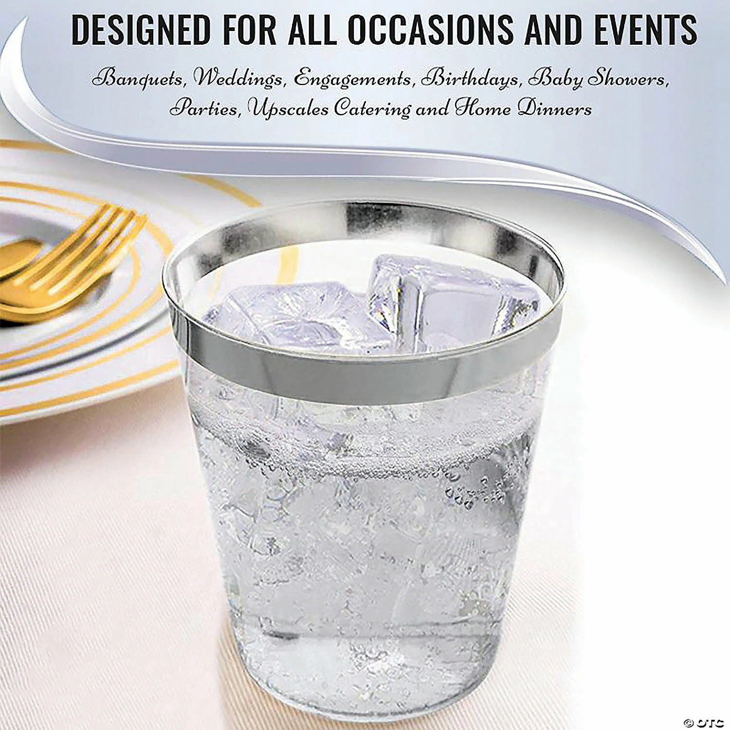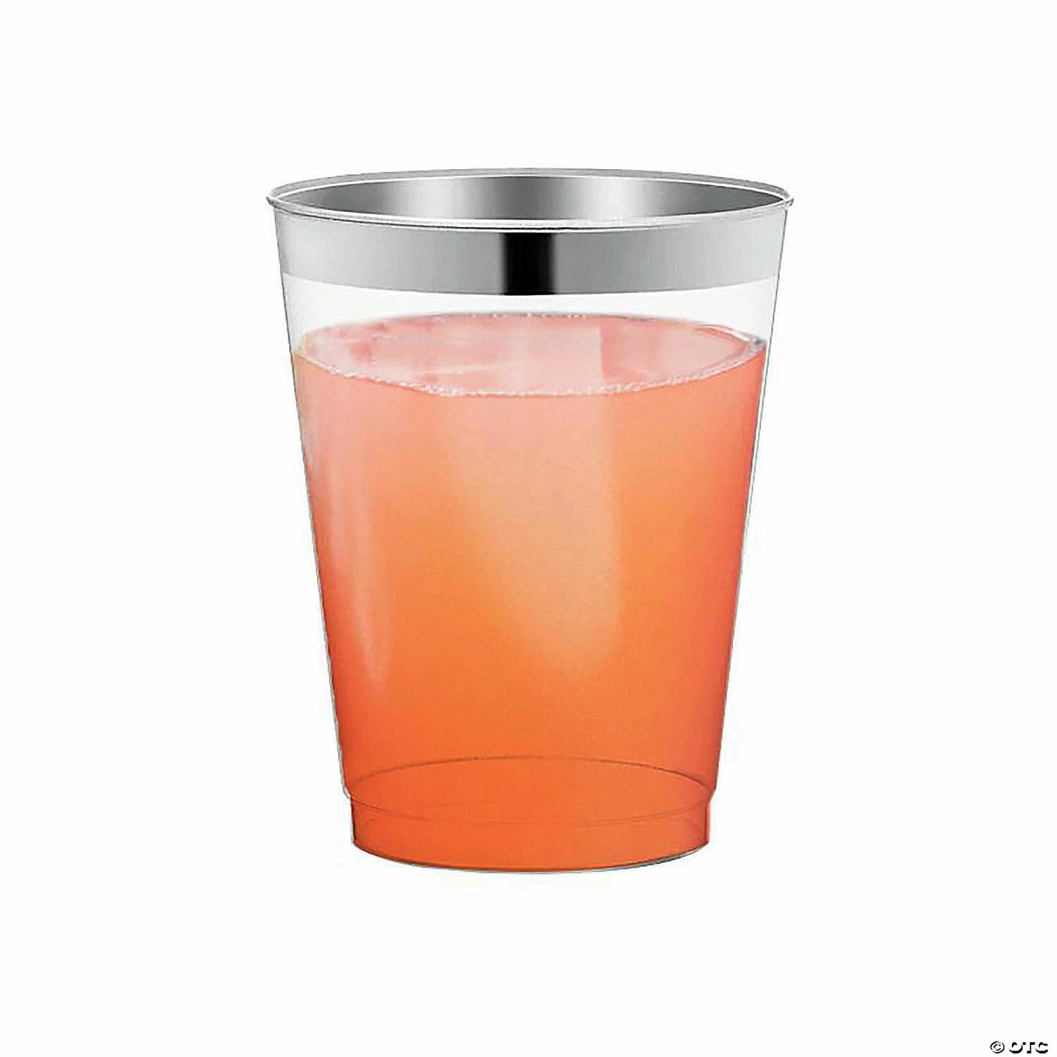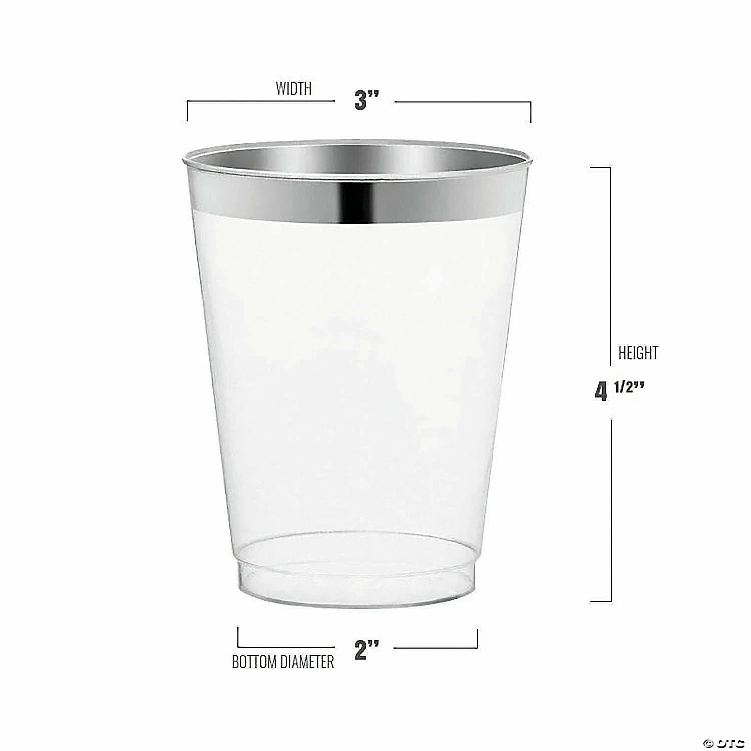 β’ Approx. top diameter: 3″β’ Approx. bottom diameter: 2″β’ Approx. height: 4 Β½”β’ Flush fill capacity:Β 12 ozβ’ Practical fill capacity:Β 10 ozβ’ Quantity:Β 5 packs of 20 tumblersβ’ Color:Β Clear with Metallic Silver Rimβ’ Shape:Β Roundβ’ Material:Β Plasticβ’ Disposable:Β One-time, single party useβ’ Recycling code:Β #6 PS Polystyreneβ’ BPA-free:Β YesΒ Β Special Shipping Information:Β This item ships separately from other items in your order.Β This item cannot ship to a P.O. Box.Β This item may be subject to additional processing days.Β Β Item is not eligible for expedited shipping.Β Β Β Β You may initiate a return for unused items within 30 days, if the items are in original packaging with all original materials included with the shipment.