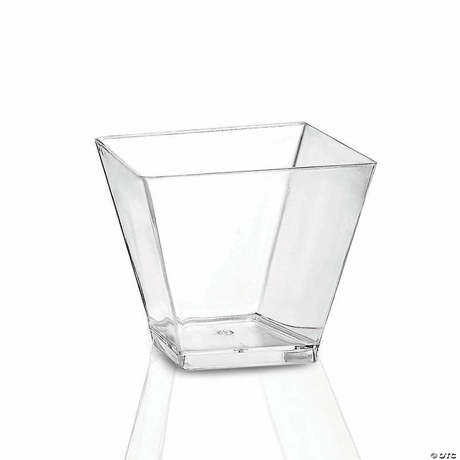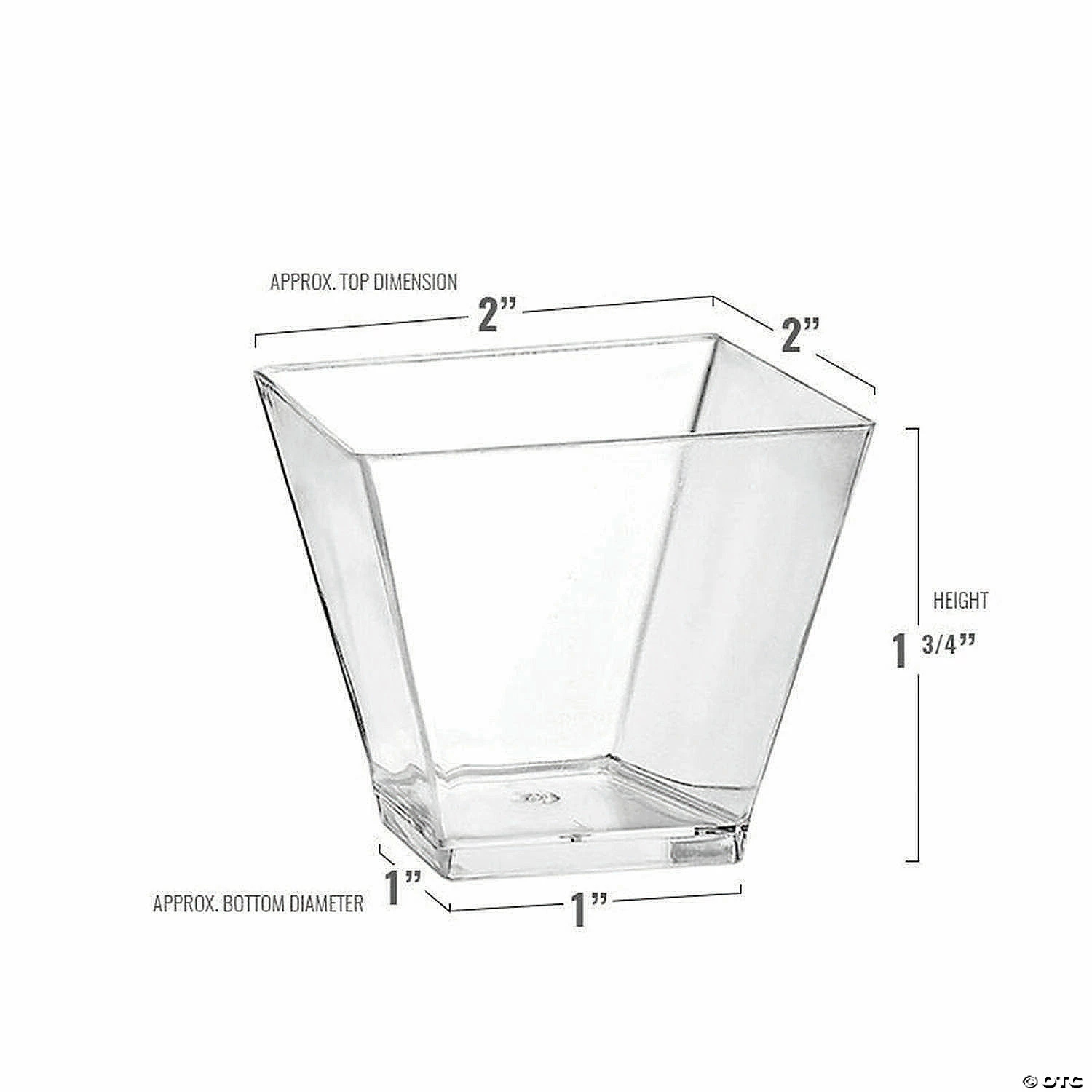 β’ Approx. top dimensions: 2″ x 2″β’ Approx. bottom dimensions: 1″ x 1″β’ Approx. height: 1 ΒΎ”β’ Capacity: 2 ozβ’ Case quantity: 20 packs of 12 cupsβ’ Color: Clearβ’ Shape: Squareβ’ Material: Plasticβ’ Disposable: One-time, single party useβ’ Recycling code: #6 PS Polystyreneβ’ BPA-free: Yes Special Shipping Information: This item ships separately from other items in your order. This item cannot ship to a P.O. Box. This item may be subject to additional processing days. ITEM IS NOT ELIGIBLE FOR EXPEDITED SHIPPING You may initiate a return for unused items within 30 days, if the items are in original packaging with all original materials included with the shipment.