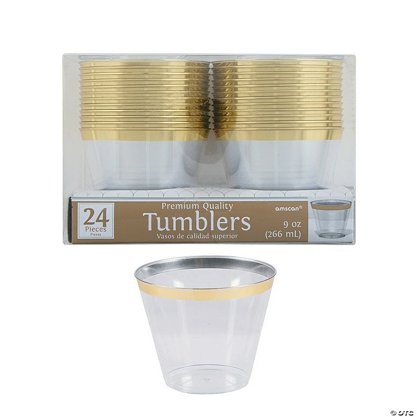Add some elegance and shine to your reception bar supplies or at your next gathering with these gold trimmed plastic tumblers. Great for cocktails, punch or carbonated drinks, these disposable cups will make cleanup a breeze! Impress guests at your party or event with cups that add sophistication to your bar. Plastic. (96 pcs. per unit) 2 3/4″ 9 oz. Not microwave safe. Hand wash only.