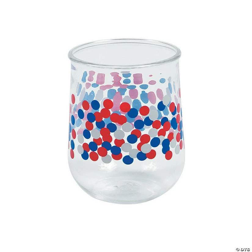 Party with a pop of patriotic style! Ideal for party supplies, summer wedding receptions or lazy days spent poolside, these elegant stemless wine glasses feature an eye-catching design of red, white and blue confetti. Since these glasses are made of plastic and don’t have a fragile stem, don’t worry if the fun gets a bit too festive. These durable cups are up for the test. They are even great for creating Uncle Sam-approved Fourth of July place settings – just stuff a napkin inside each and voilΓ ! Pour on more savings when you shop our entire selection of patriotic confetti tableware on this website! (6 pcs. per unit) 4 3/4″ 12 oz. Β© OTC