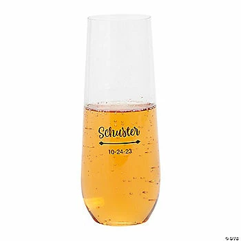 Give your wedding reception, anniversary party, rehearsal dinner or engagement party a personalized touch with these lovely plastic champagne flutes. The stemless design of these plastic flutes gives them a sophisticated look and the personalized text makes them even more special. Cheers to a special gathering with these stemless champagne flutes! Plastic. (4 dozen per unit) 5 3/4″ 9 oz. Personalize with 2 lines of text. Β© OTC