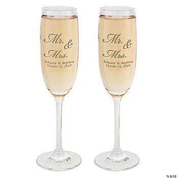 This elegant set of champagne flutes is a perfect wedding gift for a special couple! They are wonderful table decorations when you tie ribbons around the bases and fill them with some sparkling golden bubbly! Personalized champagne glasses make beautiful keepsakes that the newly-minted Mr. and Mrs. will treasure and use for years to come. Order several and give one to each member of the bridal party as a unique memento from a very special day. Personalize each glass flute with 4 lines of silver text: 4 characters/spaces on lines 1-2; 20 characters/spaces on lines 3-4. (2 pcs. per set) 9 1/8″ 8 oz. ยฉ OTC