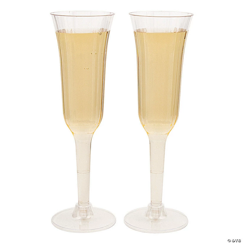 Set yourself up for easy cleanup with these disposable champagne glasses! Just as stylish as glass flutes, these plastic flutes feature a flared design and a stylish pattern of lines. Perfect for an outdoor wedding or a champagne toast for a large crowd, the two-piece champagne flutes wonβt break and are easy to transport to your venue! Plastic. (10 pcs. per unit) 8″ 6 oz. Simple assembly required.